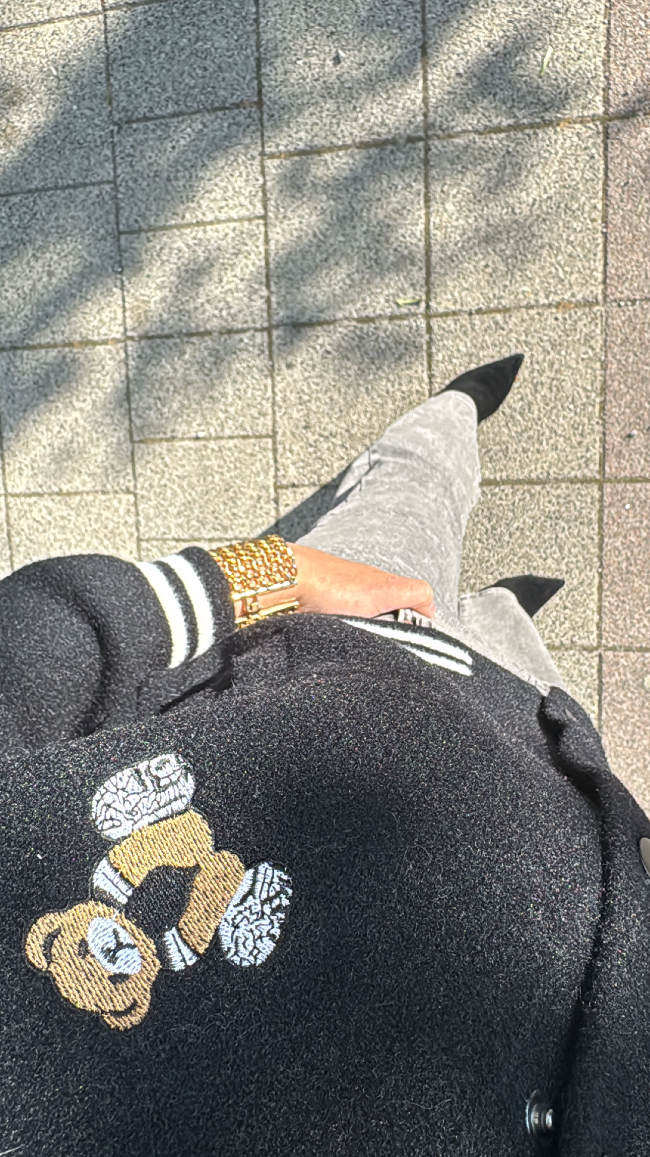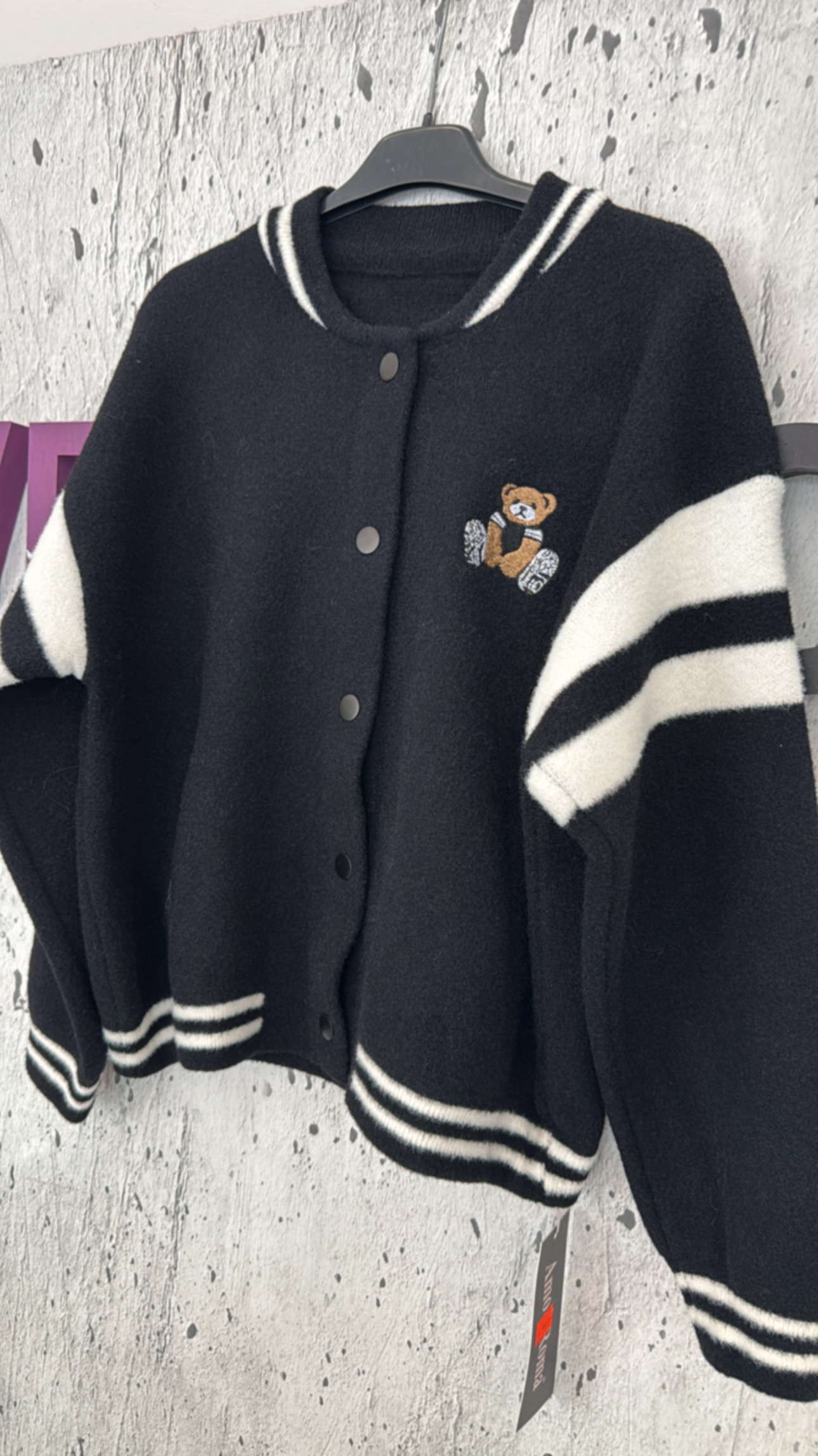 Rozkošný a štýlový zároveň – čierny sveter vo „college“ štýle s kontrastnými bielymi pruhmi a roztomilým medvedíkom. Zapínanie na cvoky, príjemný hrejivý materiál a ležérny strih, ktorý sa hodí k rifliam, legínam aj k sukni.