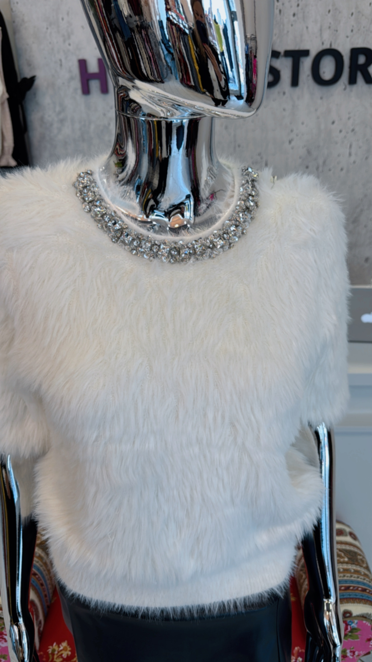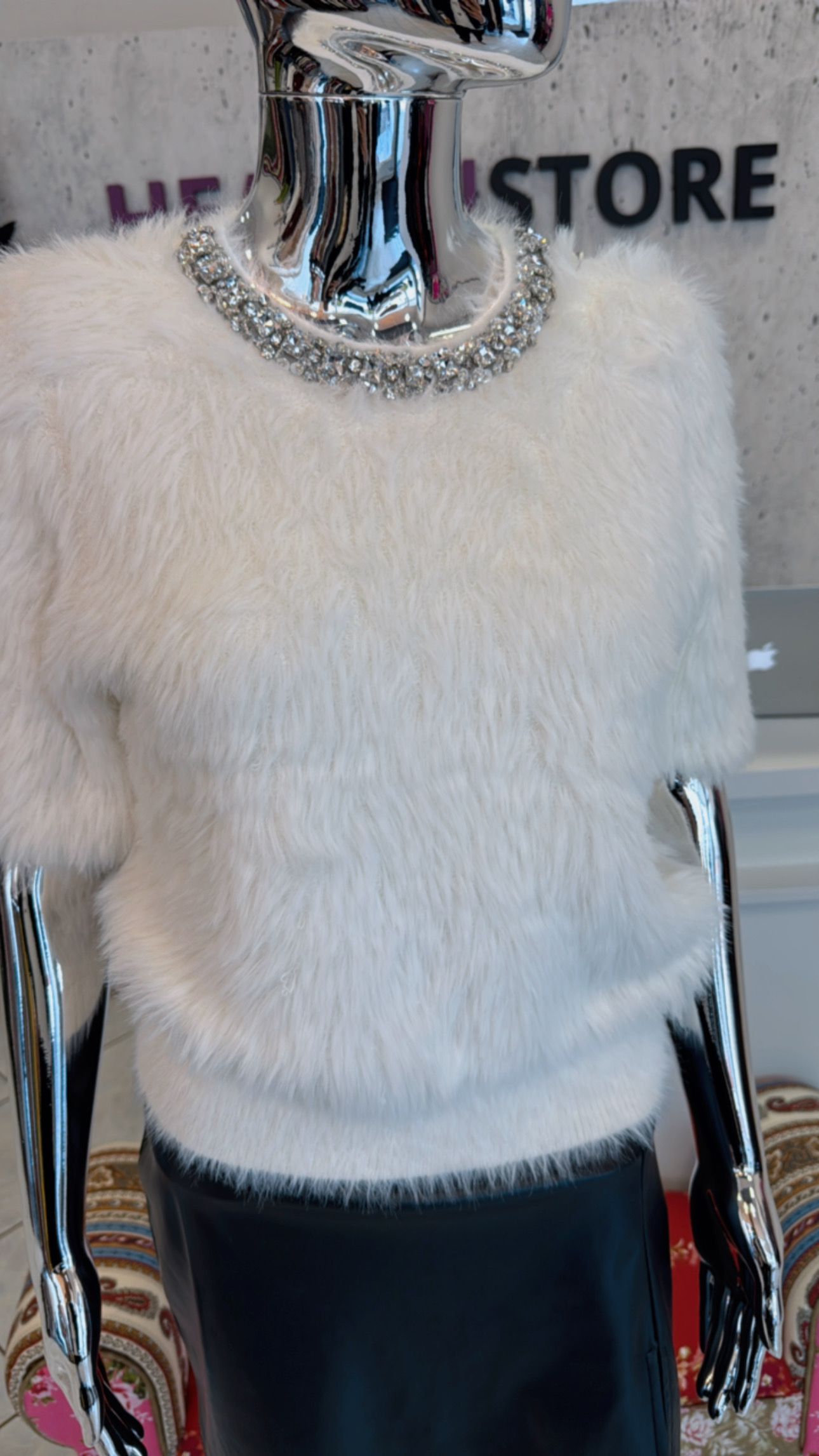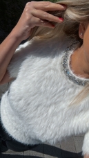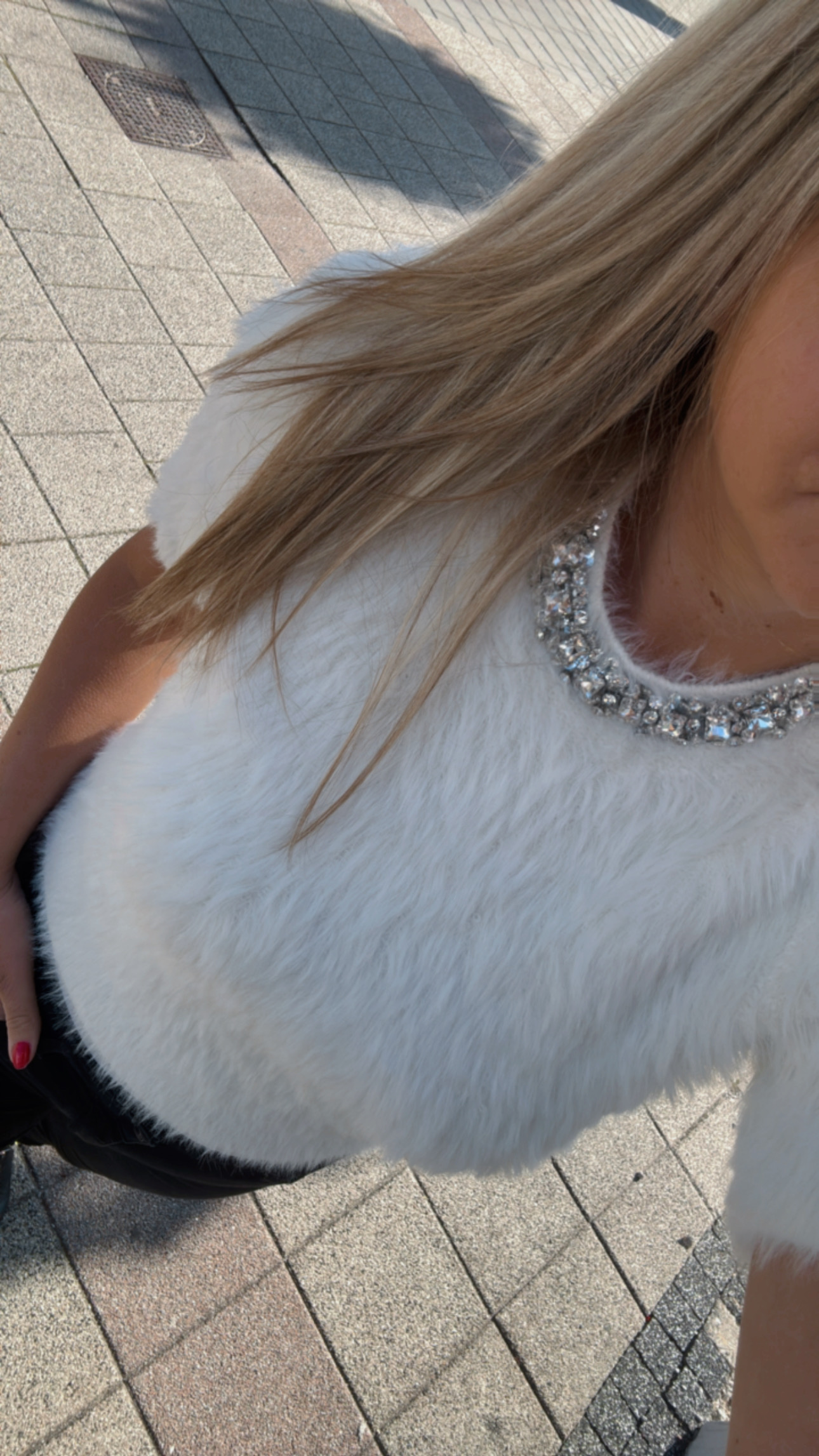 Dodajte svojmu outfitu nádych luxusu! Tento biely top s jemným kožušinovým efektom pôsobí štýlovo a zároveň hrejivo. Ozdobný výstrih s trblietavými kamienkami krásne zvýrazní dekolt a urobí z neho ideálny kúsok na špeciálne príležitosti aj večerné outfity. Perfektne sa kombinuje so sukňou, elegantnými nohavicami či rifľami.
